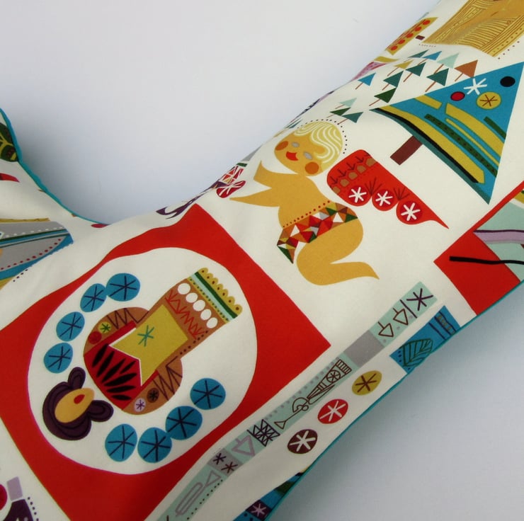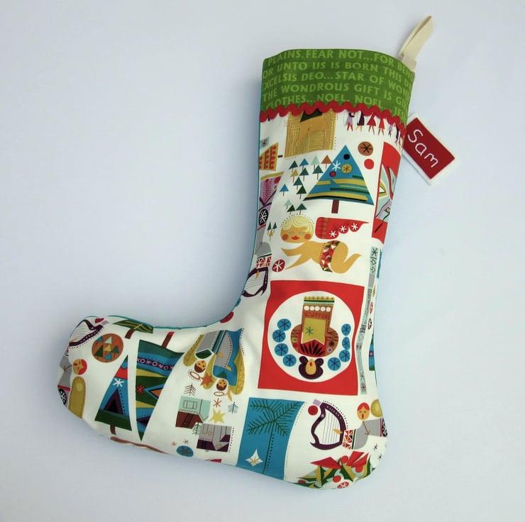 This retro Christmas stocking has colourful nativity scenes and is perfect for sharing the real Christmas story with your children. It's fun images and strong colours will appeal to children and adults, and the generous size means Santa can fill it with lots of presents. And the hand embroidered name tag makes sure Santa knows who it belongs to.