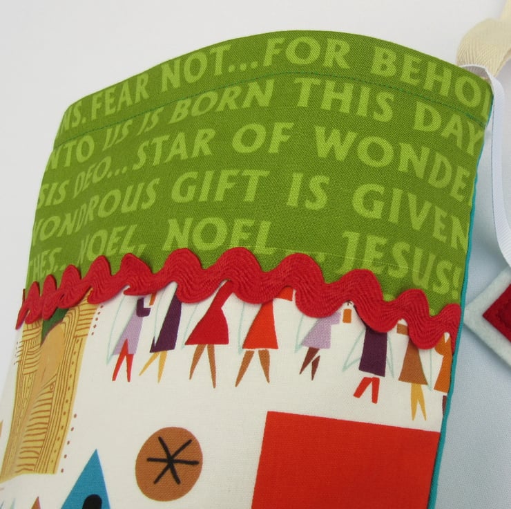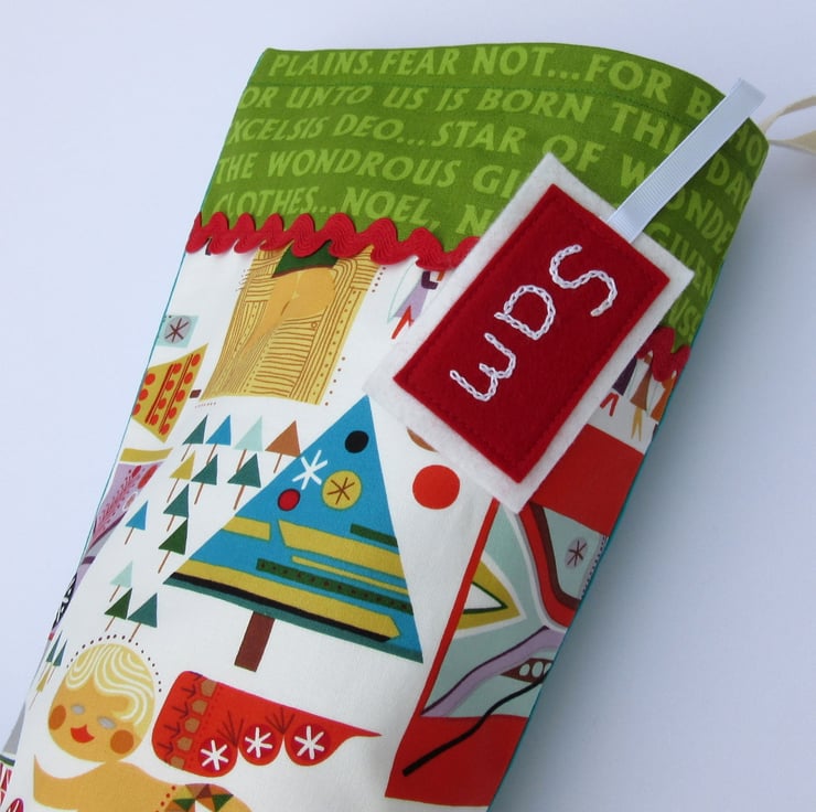 I've trimmed it with wide ric-rac trim and a top panel featuring words from traditional Christmas carols. Backed in dark aqua or red cotton and lined in white, the stocking has a hanging loop so it can be hung up for display before filling with gifts.