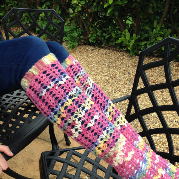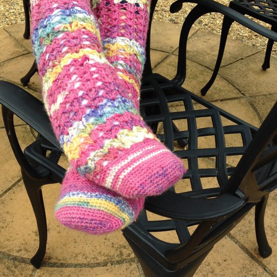 This pair of crochet lacey knee-high socks are made to order and available in UK sizes 3-4 (small), 5-6 (medium) and 7-8 (large).