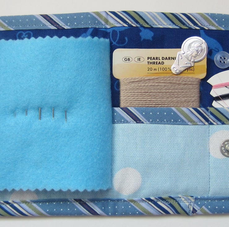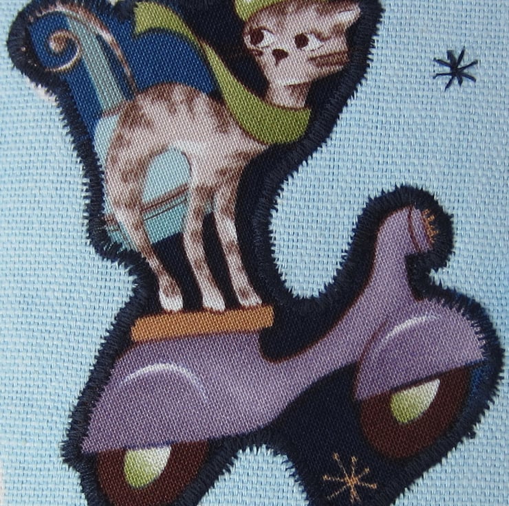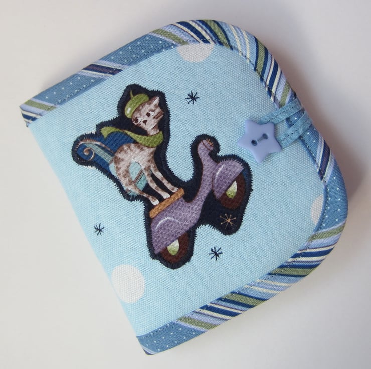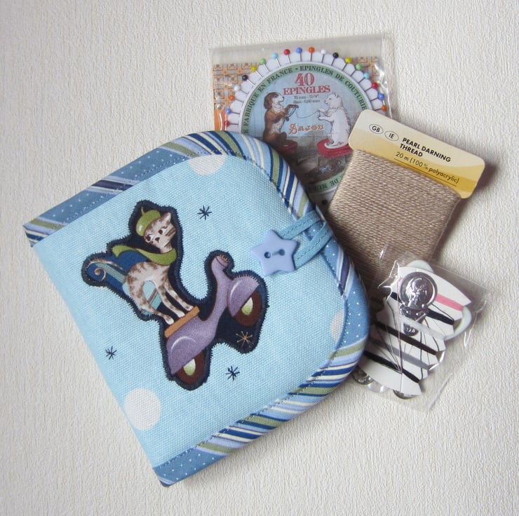 Lightly padded appliqued cat on scooter needle case with extra pockets inside to hold various sewing items. Blue felt page inside and fastens with a loop and star button. Comes complete with all the sewing accessories shown; selection of needles, 40 pins on wheel, darning thread, sewing thread, needle threader, small scissors, 2 buttons and a press stud fastener. Needle case measures 12.5 x 13.5 cm when closed (25 x 13.5 cm open).