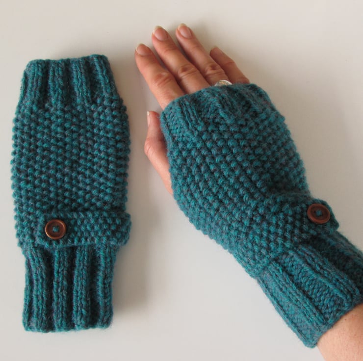 These deep teal green fingerless mittens / wrist warmers / gloves are knitted in a rib and moss stitch pattern and are hand knitted in a lovely and warm Aran wool, which comprises of 25% pure wool and 75% acrylic wool.