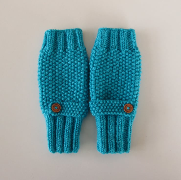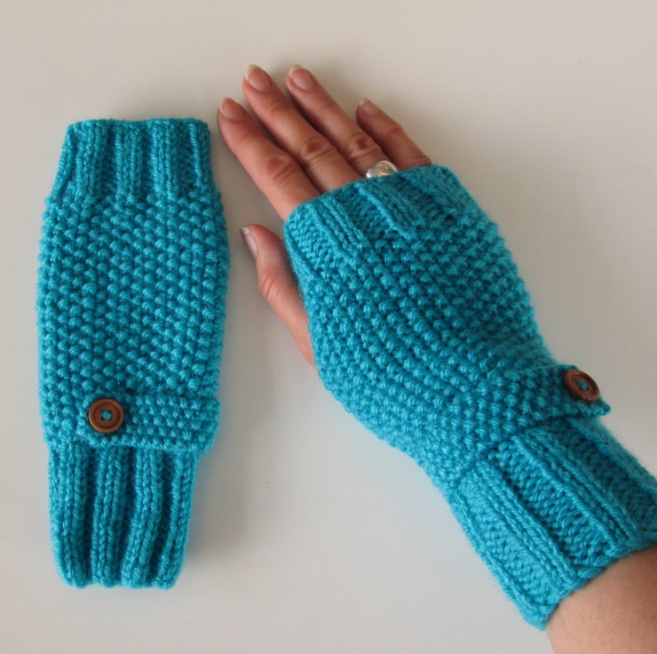 These turquoise fingerless mittens / wrist warmers / gloves are knitted in a rib and moss stitch pattern and are hand knitted in a lovely and warm Aran wool, which comprises of 25% pure wool and 75% acrylic wool.
