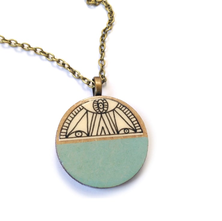 Wooden circle, half painted in duck egg blue and the other half features an illustrated ink pattern on cream paper. Covered with varnish and finished with a protective layer enamel.