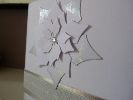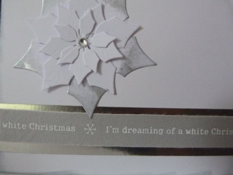 A completely hand made and uniquely designed pack of cards. Consisting of a poinsettia die cut from white card the bottom layer has been silvered to show of the embossed veins. The centre has been decorated with a silver rhinestone. Finished off with pale grey ribbon with the words 'I'm dreaming of a white Christmas' which has been mounted onto silver card. All then mounted onto quality white card which has had the edges silvered.