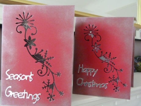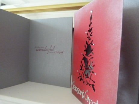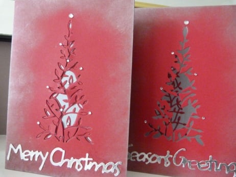 A completely hand made and uniquely designed pack of 5 cards. Consisting of two designs, a Christmas tree and a festive garland. Both have been die cut from quality red card, the cut out has been mounted onto the insert allowing it to show through. The cut outs have been decorated with small silver rhinestones. A festive greeting has been die cut from silver card. All edges of the card have been silvered to give a really festive look.