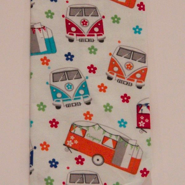 Hand finished ties in a cotton fabric featuring camper vans in a flower-power style. These novel ties are ideal for a camper van enthusiast or someone longing to re-live the swinging 60’s!