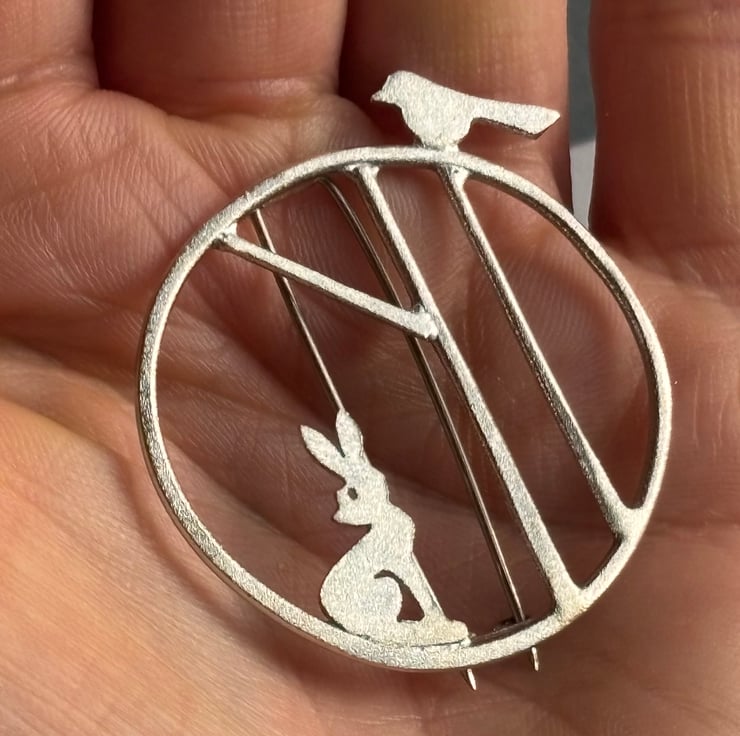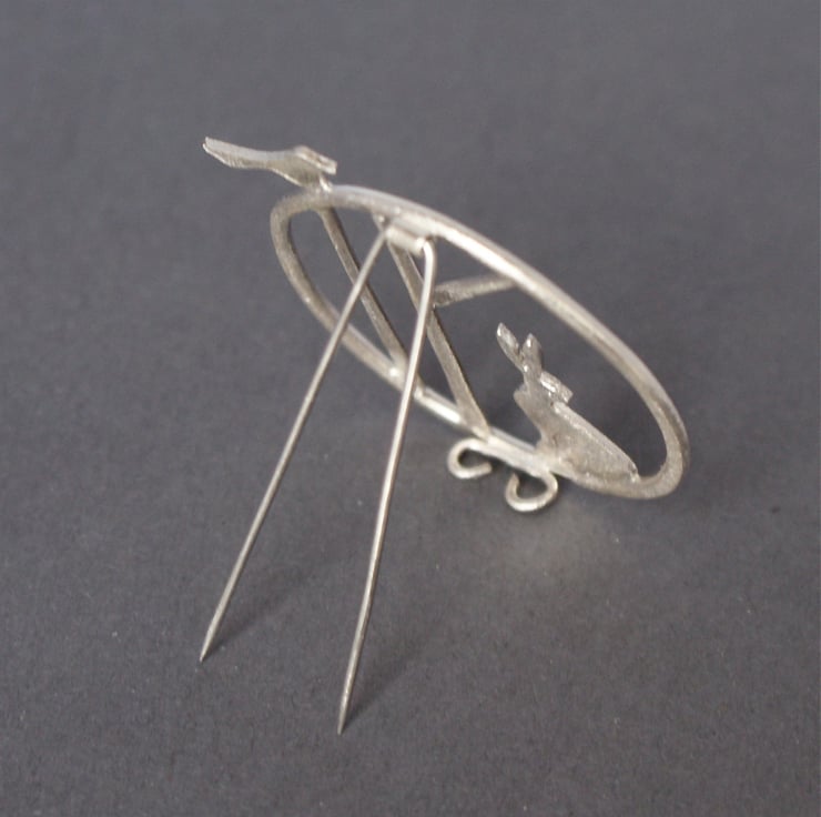 Gorgeous statement brooch featuring 2 stylized trees with a little hare and a bird. Soldered within a hand forged irregular circle for an organic feel and finished with a lovely frosted texture which has a subtle sparkle and is slightly rough to the touch. The brooch pin is made from stainless steel and is slightly tricky to fasten although very secure - it is made like this to prevent the pin being seen through the framework. Please note your brooch may vary very slightly from the image as each one is completely hand made.