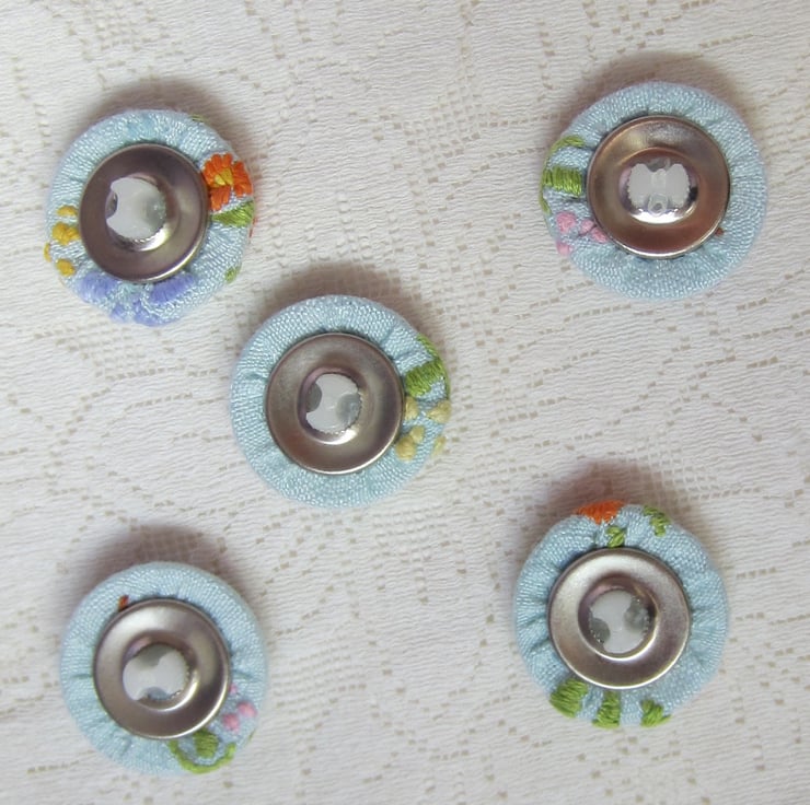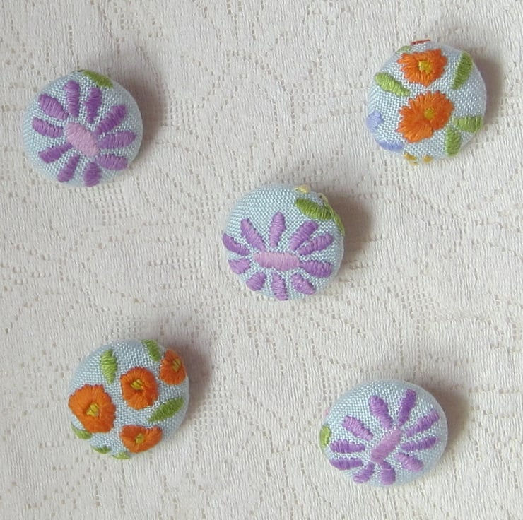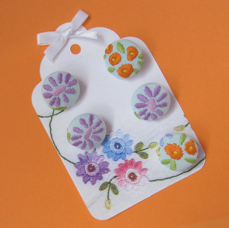 5 pretty buttons made from vintage embroidered fabric. Three lilac flowers and two orange on light blue background. Each button measures 24 mm across. Supplied on pretty gift tag as shown.