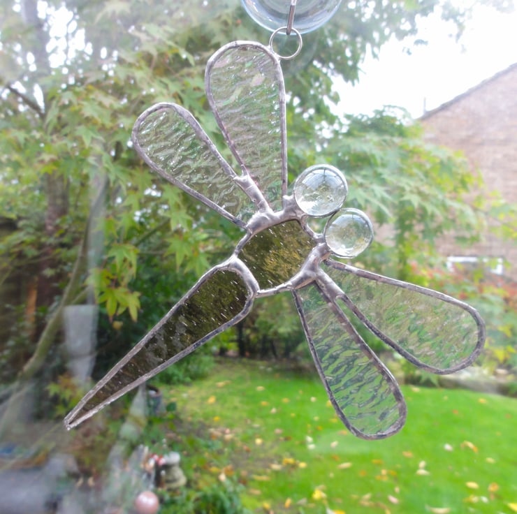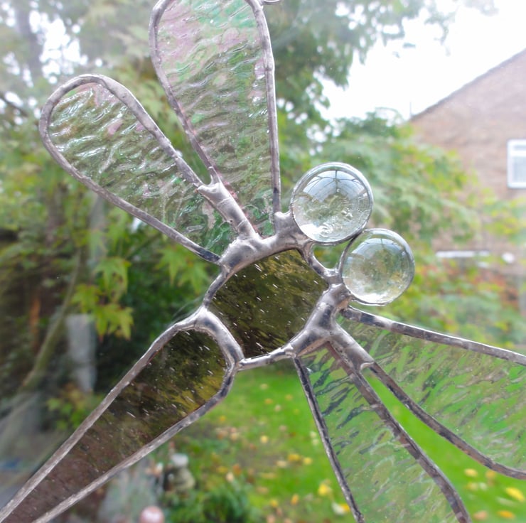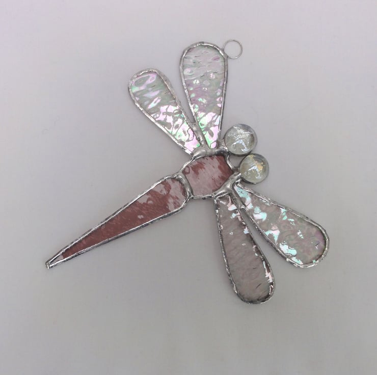 This dragonfly has been made from a beautiful pale pink textured glass and irridised glass for the wings. Each piece of glass as been copper foiled and soldered together. Glass nuggets have been attached for the eyes. I have attached a wire ring for hanging purposes and will supply one window hook so that you can had the sun catcher in your window as soon as received.
