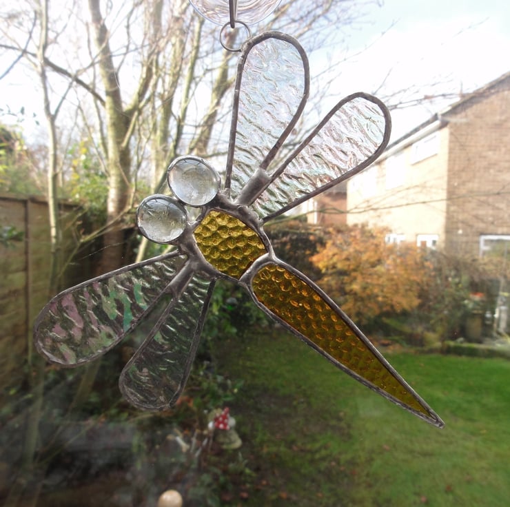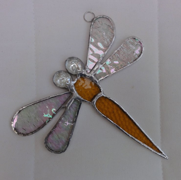 This dragonfly has been made from a beautiful amber hammered glass and irridised glass for the wings. Each piece of glass as been copper foiled and soldered together. Glass nuggets have been attached for the eyes. I have attached a wire ring for hanging purposes and will supply one window hook so that you can had the sun catcher in your window as soon as received.
