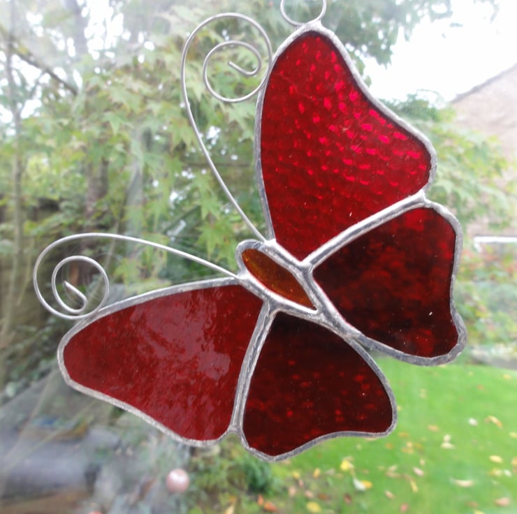 The glass used in this sun catcher is red hammered glass and red cathedral glass for the wings and red and orange streaky glass for the body.