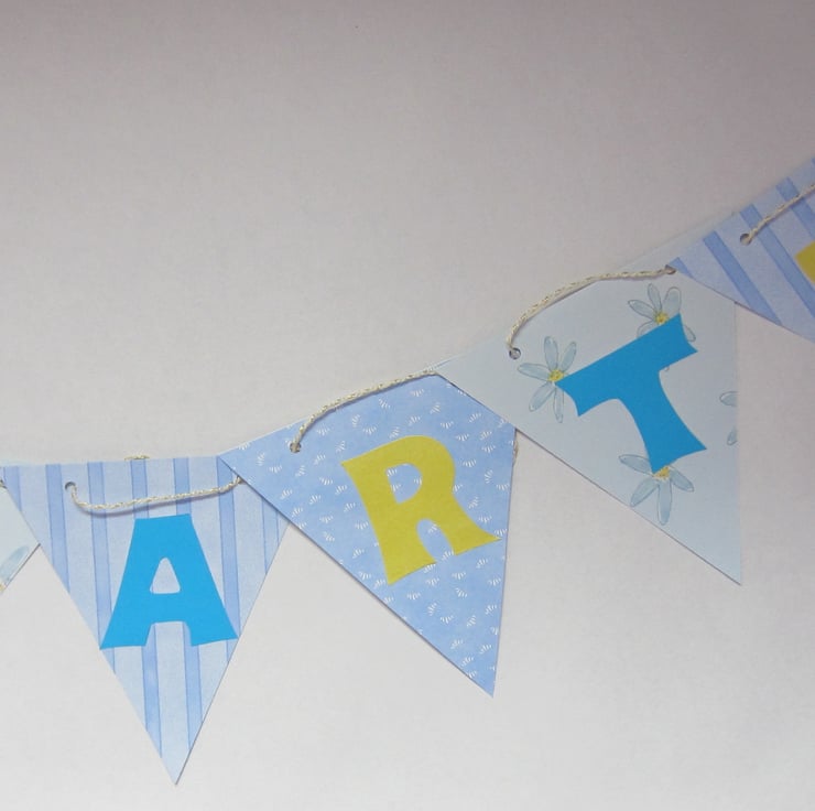 9 flag thick paper blue and yellow bunting, spelling out the words TEA PARTY with a flower embellishment in between.The bunting is double sided but only has the lettering on one side. Each flag measures 15 x 15 cm and the whole string is over 2.5 metres. Flags can be arranged along the string as required.