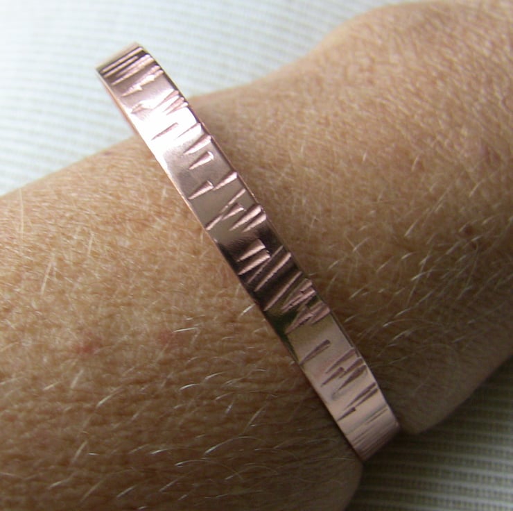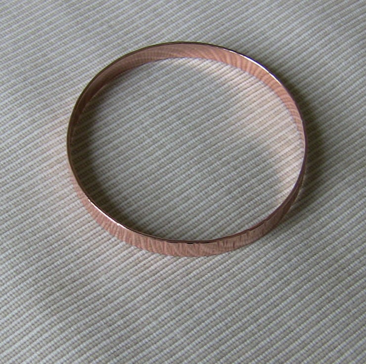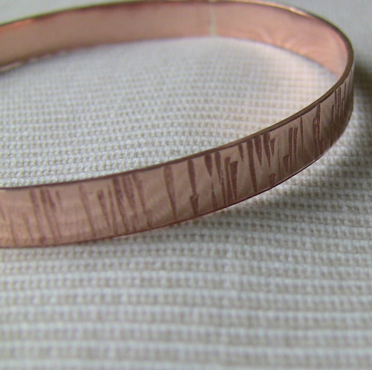 This lovely copper bangle is sturdily constructed from 1mm thick copper sheet which has been cross-hammered to give it texture and then soldered using silver solder. A thin silver seam is visible. The metal is 7mm wide and the bangle has an internal diameter of 6.4cm. It has been tumble-polished to a bright shiny copper finish. If you prefer I can darken it with oxidising solution to give a bronzed, antique effect and also treat it with metal lacquer to reduce tarnishing.