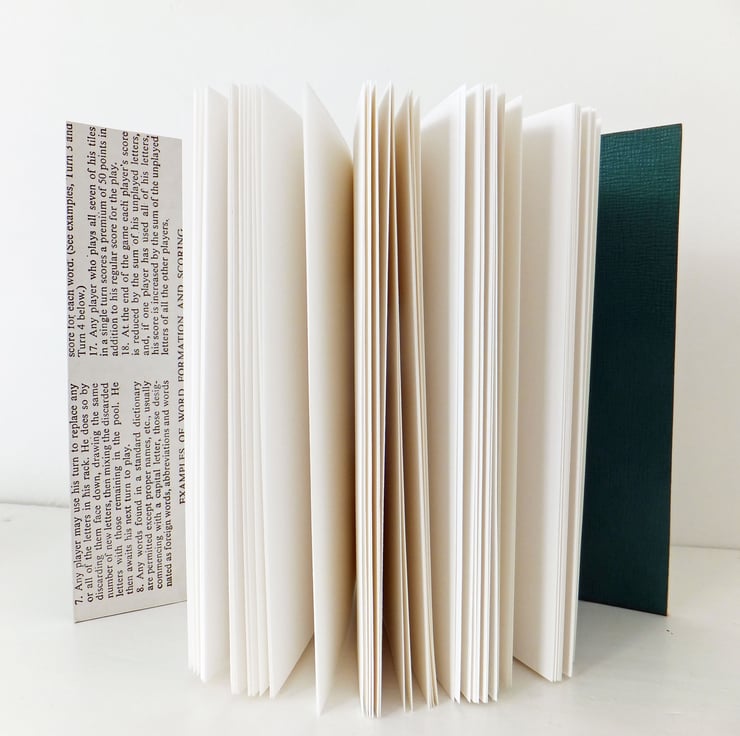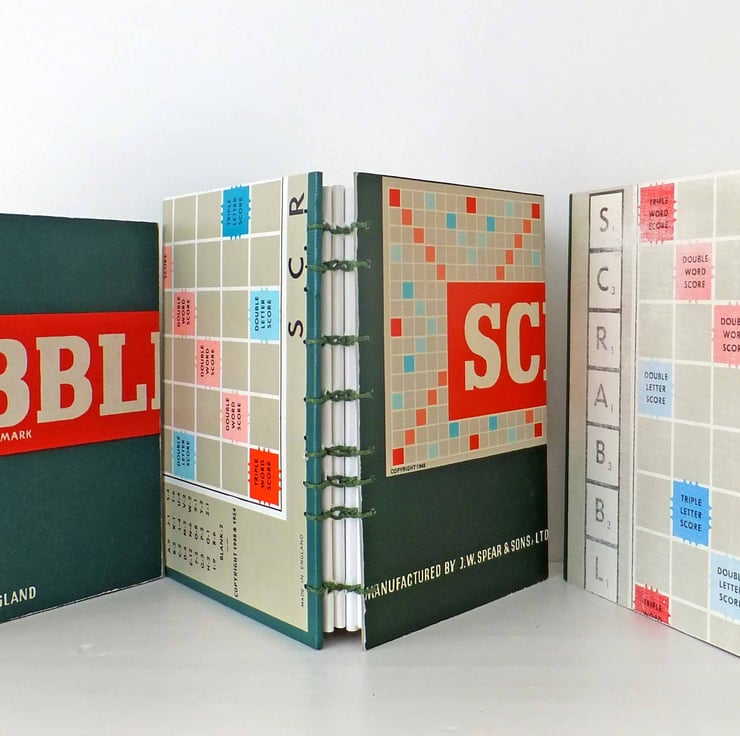 This handmade notebook has been made from a much-loved, vintage Scrabble game board. Inside are 96 pages (192 sides) of blank white eco-friendly paper. The covers and pages of the journal have been sewn together with strong cotton thread in a coptic stitch.