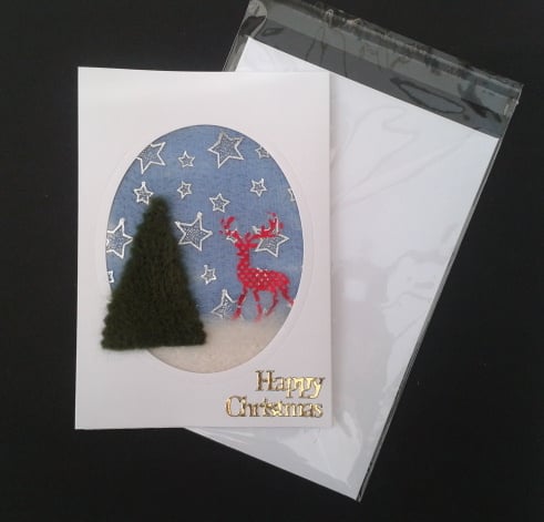 A picture consisting of a needle felted background overlaid with a sheet of sparkling organza with stars and a reindeer and mounted in an oval window frame A6 card. The addition of a felt christmas tree overlapping the card surround adds an extra touch. Gold coloured 'Happy Christmas" lettering has been added to the front. Supplied with envelope in a cellophane wrapper. Left blank inside for your own greeting.