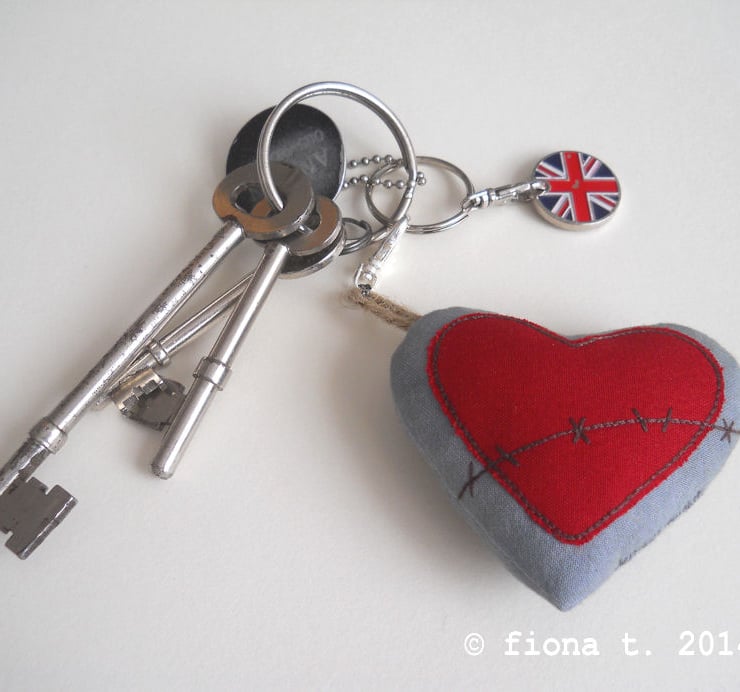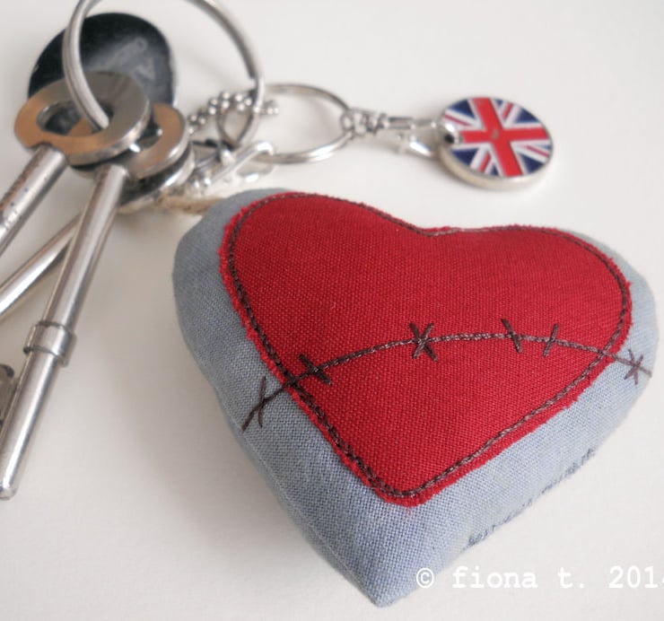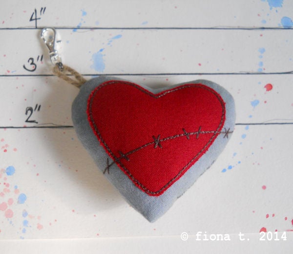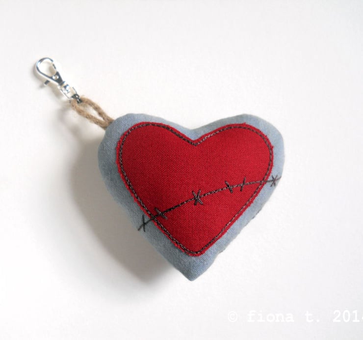 "little black heart” applique & freehand embroidered zombie heart bag charm or key fob.