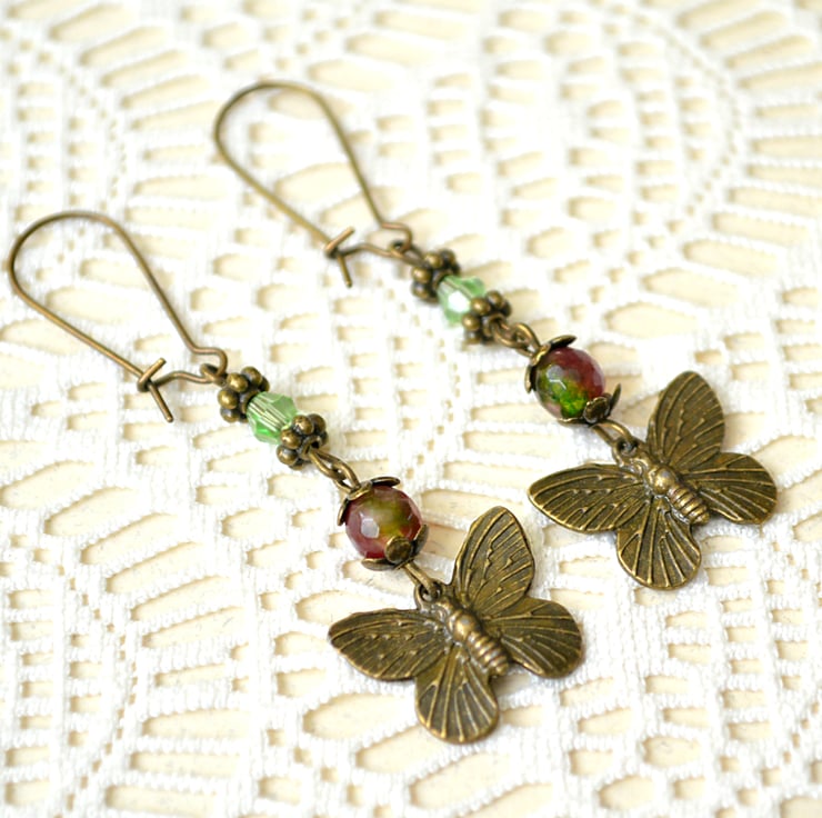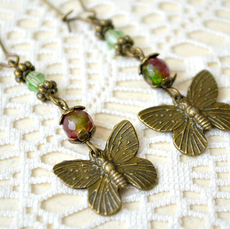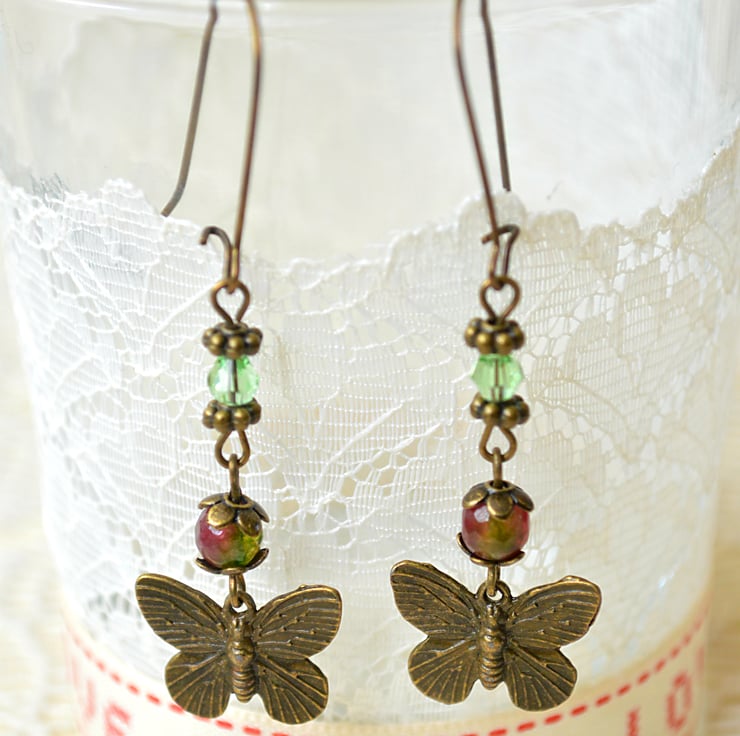Gorgeous, antique-bronze, butterfly dangle earrings with faceted Agate and crystal beads.
