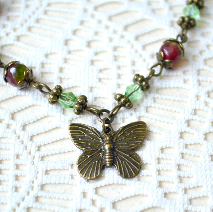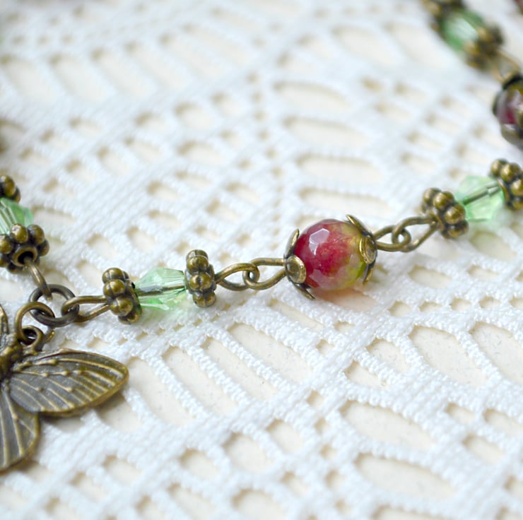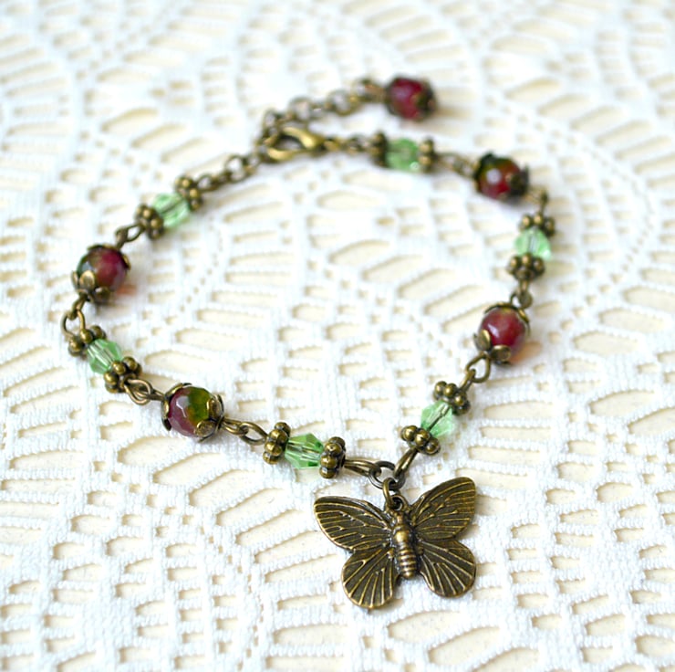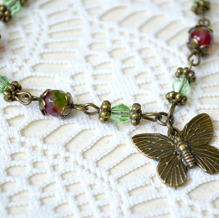 A gorgeous, vintage-inspired bracelet featuring an antique-bronze butterfly charm, faceted pink and green Agate beads and dainty pale green crystals.