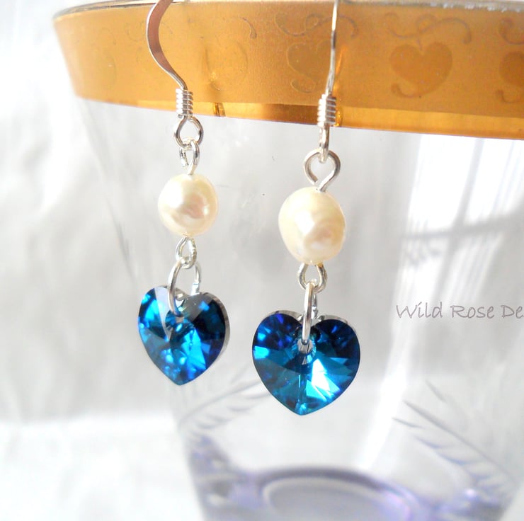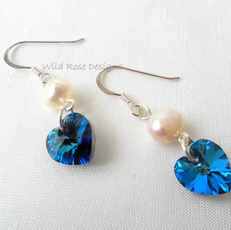 A 10 mm (3/8") Swarovski Xilion heart crystal in bermuda, hangs beneath a lustrous freshwater pearl. With Sterling silver ear wires, the total drop of these gorgeous handmade earrings is 4 cm (1 1/2").