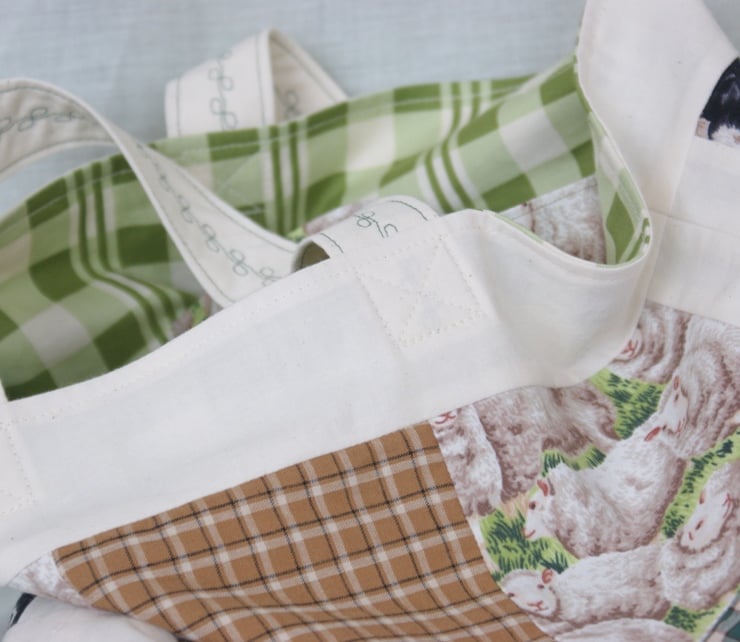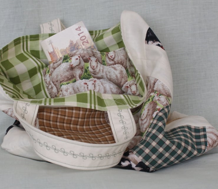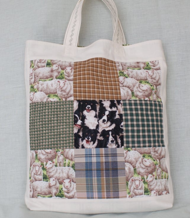 A useful and unique 100% cotton tote bag. I've used a traditional nine-patch block to showcase the sheep and collie fabrics. Lined with a cheerful green check fabric, the bag has an internal pocket and re-enforced handles featuring a top-stitched design.