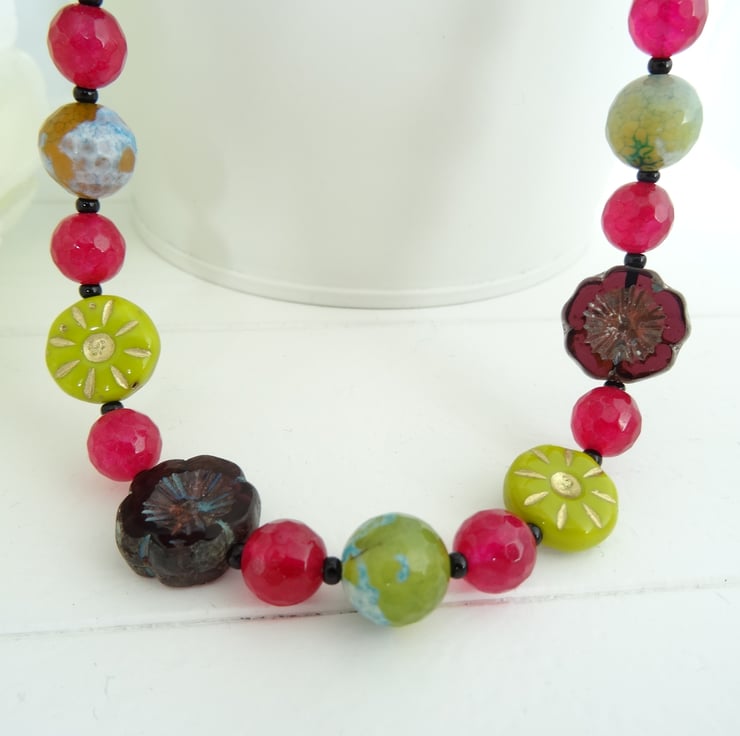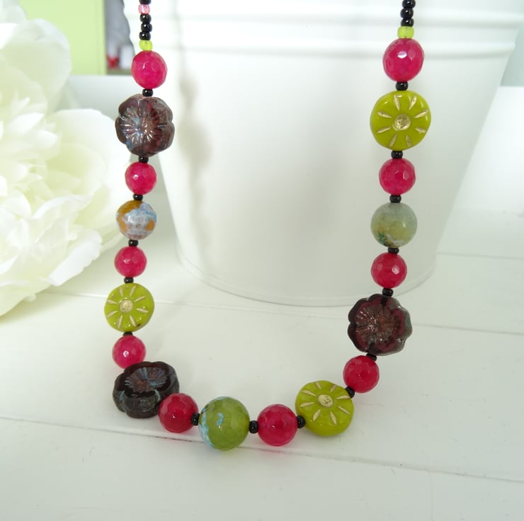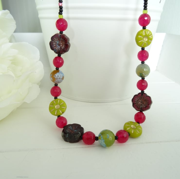 This is a lovely necklace made from 8mm faceted agate, 10mm fire agate , czech glass 14mm flower beads and 12mm czech glass daisies. The colours are a lovely combination of mulberry, lime, aubergine and green/blue. The upper body of the necklace is glass seed beads, colours black, lime and mulberry. The measurement is 45cm (17.1/2") and is finished with a black plated toggle clasp. As all of the items in my shop are individual pieces made by myself, this is the necklace you will receive. It will arrive gift wrapped in tissue paper and a organza bag.