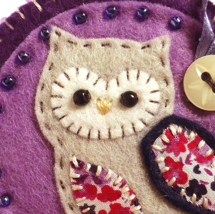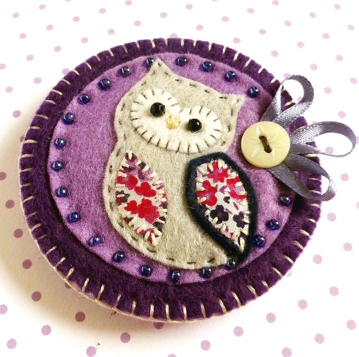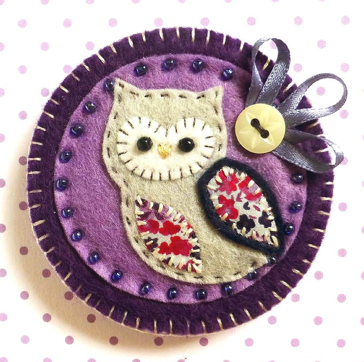 It features a little felt owl with appliqued wing and belly in pretty Liberty print fabric. It is mounted onto a purple felt base which is edged with coordinating seed beads. It is further mounted onto dark purple felt and is finished with a little cream button and ribbon detail. It has a metal brooch pin on the reverse side for easy attachment.