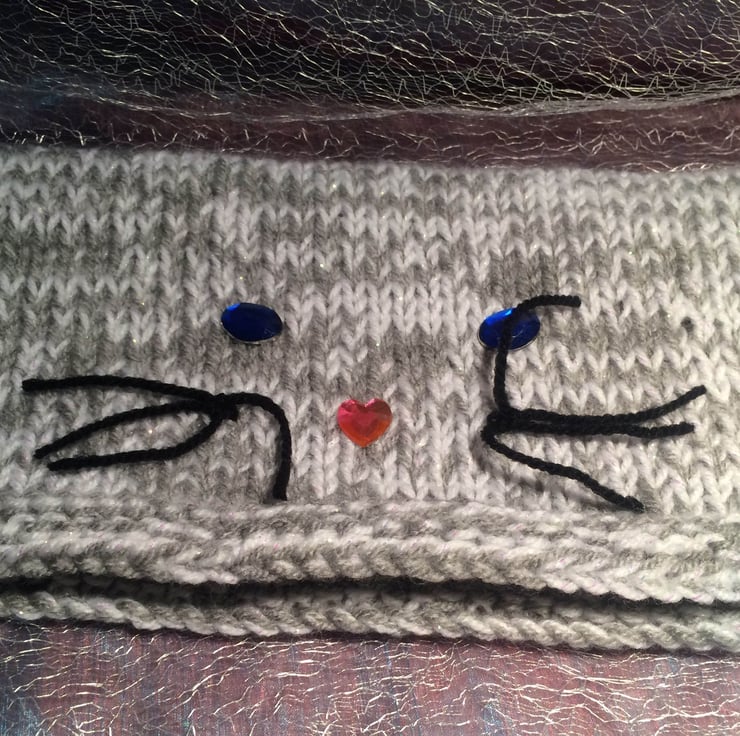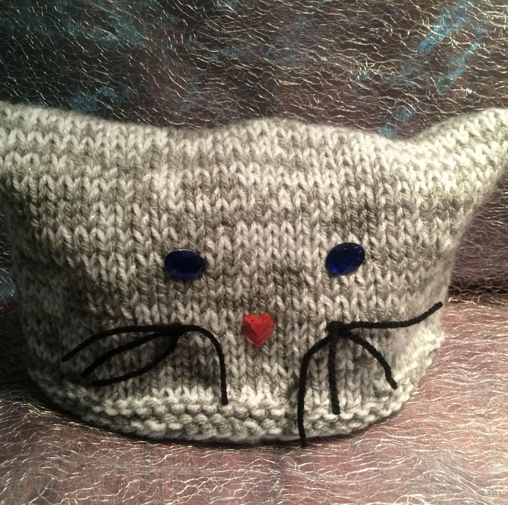 Decorative handmade wool knitted cat hat with felt decorations. Machine washable. Fits a small adult lady sized head or child 10-16 yrs.