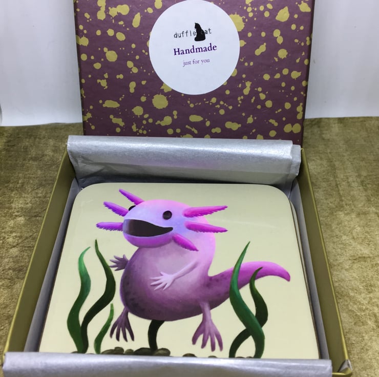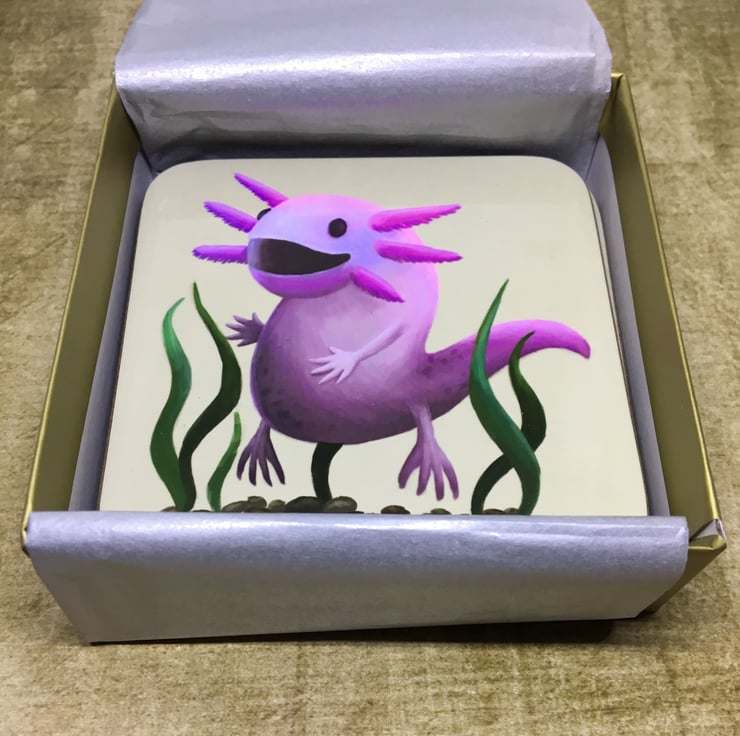 A set of 4 Axolotl Square Coasters. Unisub Hardboard Coaster, 9cm square. In a gift box.