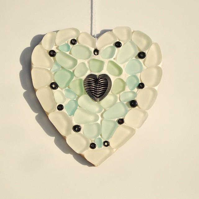 We made this pretty little wall hanger from pieces of beach glass, black glass beads and a special black and clear glass shiny heart. The heart is surrounded by pale aquamarine glass from old bottles. We have tumbled the glass so it is rounded and smooth. The back of the hanger is top quality laser cut plywood so it has a nice brown edge.