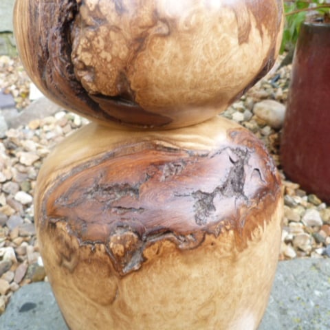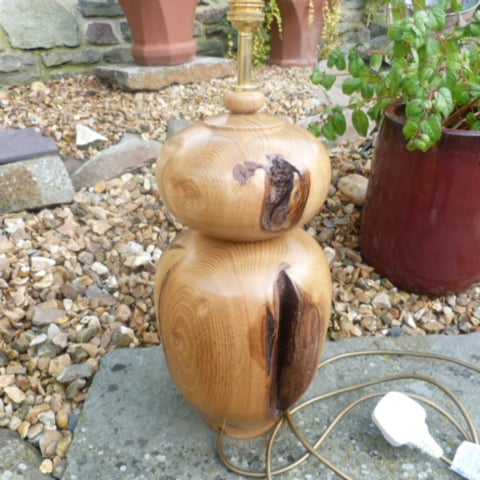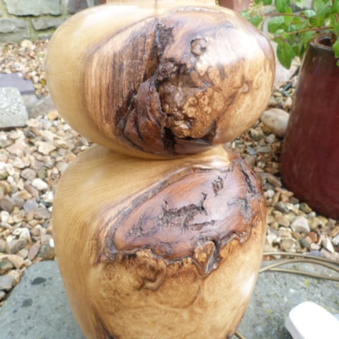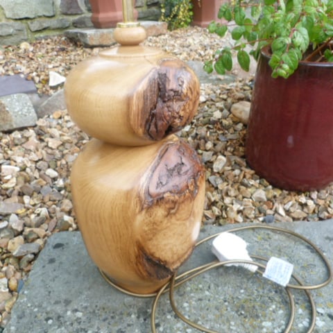 THIS LAMP IS TURNED FROM ONE PIECE OF ACCACIA THAT HAD TWO BURRS IN IT,WITH BARK INTRUSION ,SPLITS AND CRACKS, JUST AS NATURE MADE IT. TOTAL HEIGHT IS 18 -1/2'' , THE BRASSWORK IS 3-1/2'' , AT THE WIDEST POINT THE PIECE IS 7''. WIRED COMPLETE WITH INLINE SWITCH ,THE FINISH IS IN THREE COATS OF DANISH OIL AND THREE OF WOODWAX FOR DURABILITY.