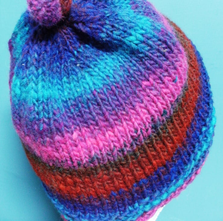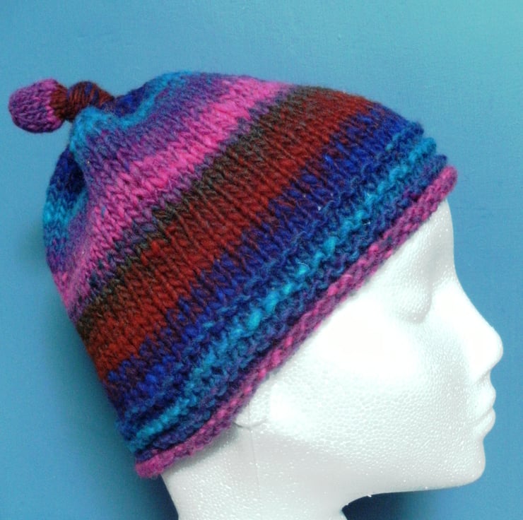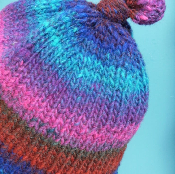 This hat has been hand knitted on the round to show off the self stripes of reds, purples, hot pinks and electric blue