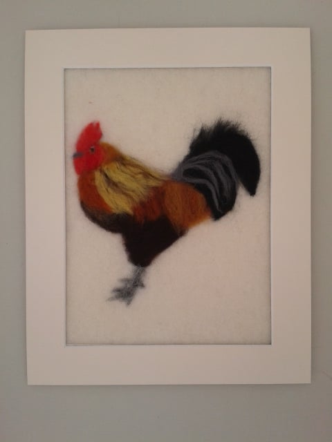 A picture of a handsome rooster created by "painting in wool". This picture has been needle felted using merino wool and is supplied mounted in a 10" x 8" mount ready for framing in a standard size frame.