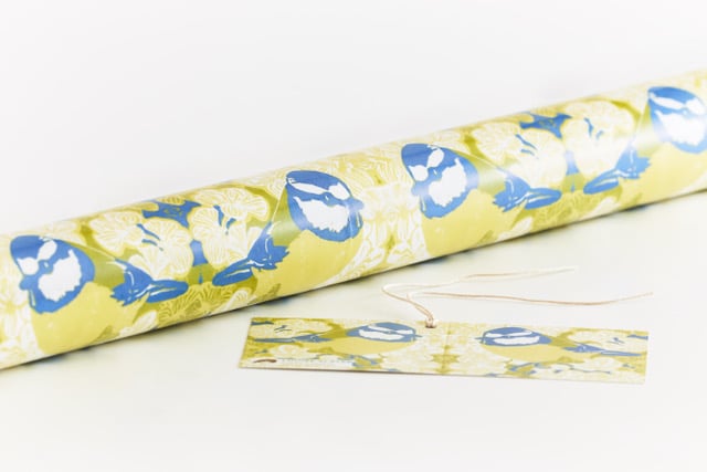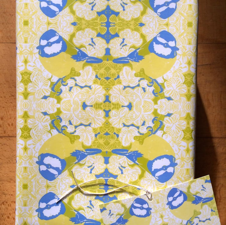 Lovely blue tit wrapping paper & tag - based on my colour reduction lino print