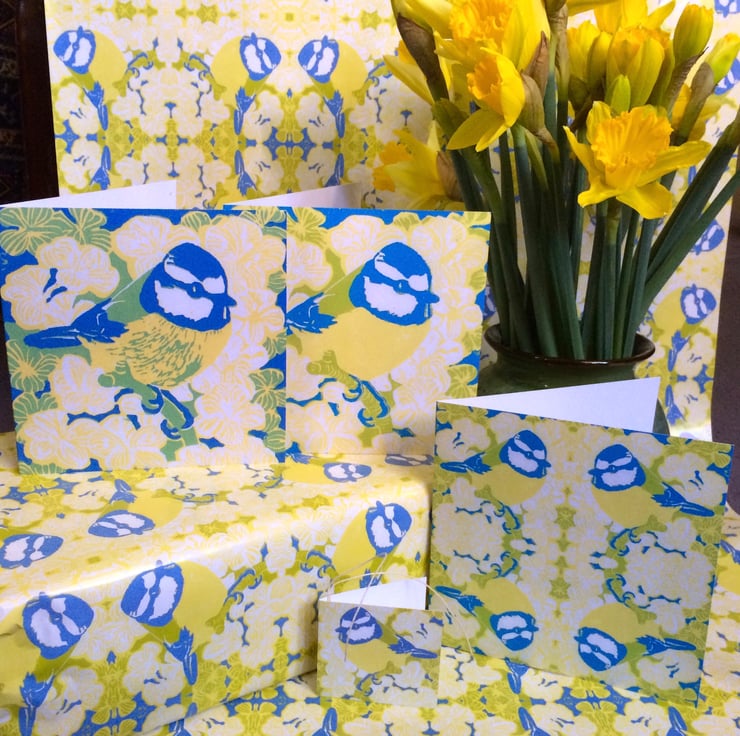This design is based on my blue tit lino print - a three colour reduction hand made lino print. It was a lot of fun experimenting with lots of repeat pattern designs!