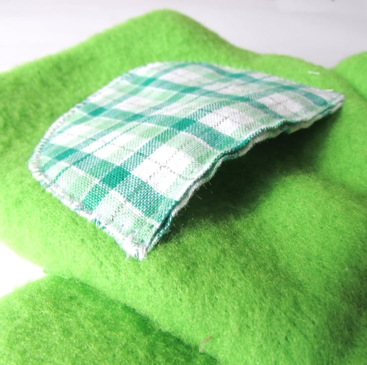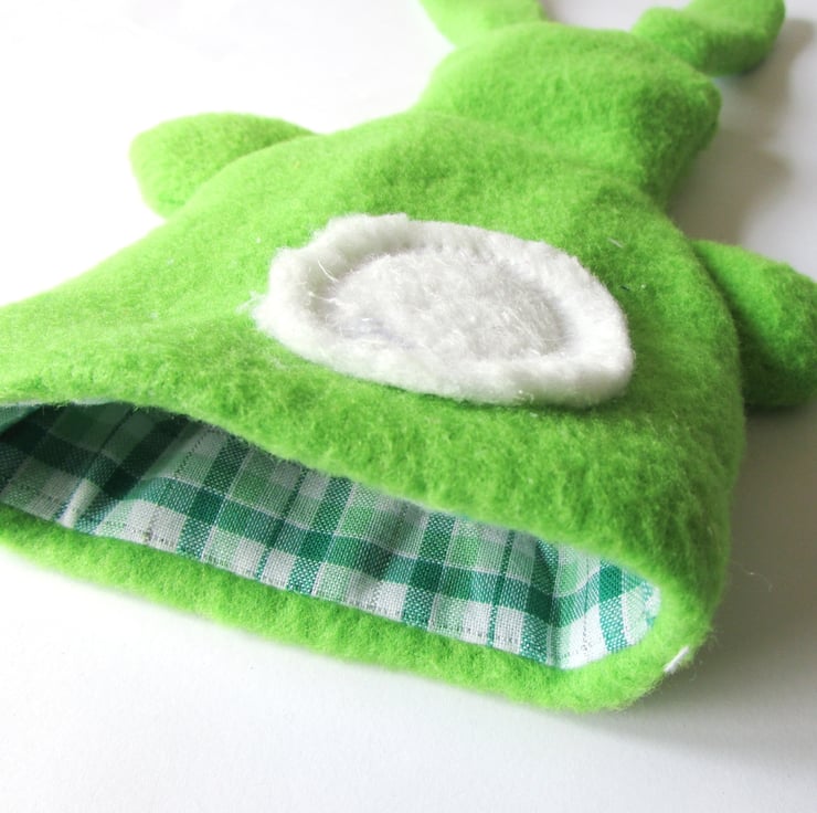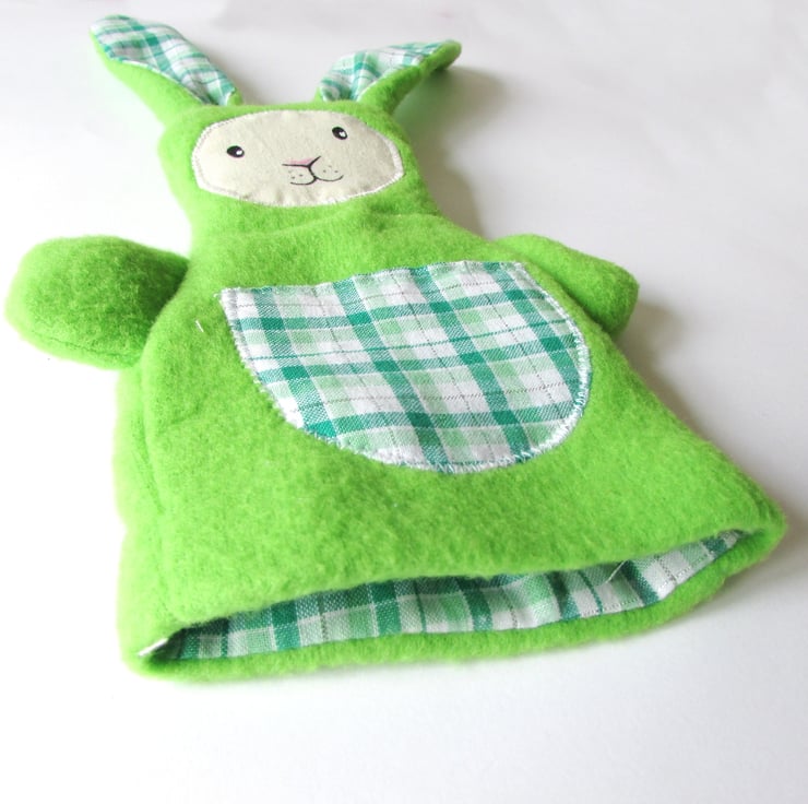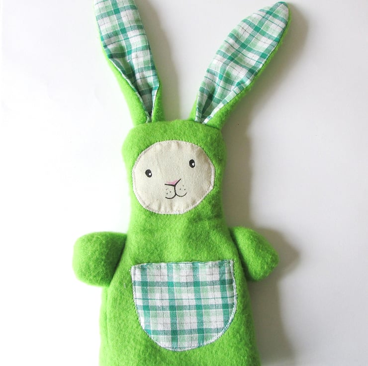 Made from a lovely soft Fleece Fabric with the ears, pocket and lining in a green & white check cotton fabric. This bunny has a handpainted face.