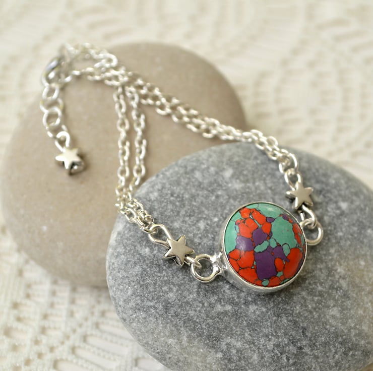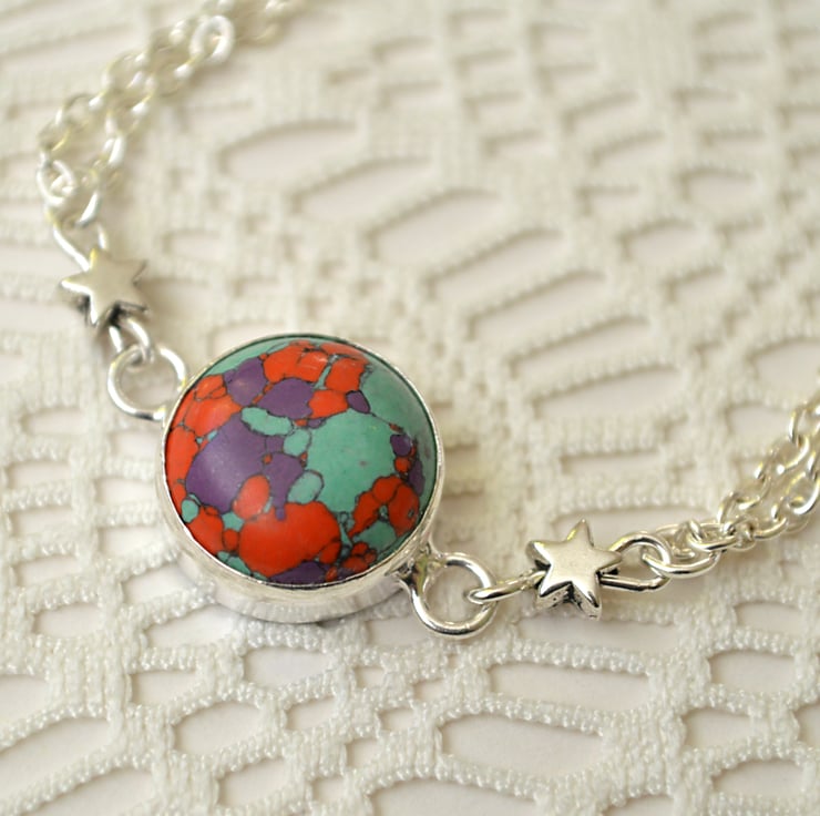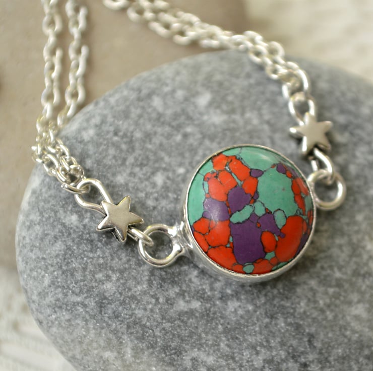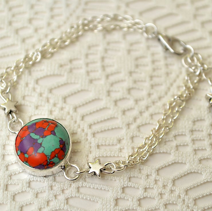 A gorgeous bracelet featuring a mosaic Jasper cabochon in turquoise, red and purple, set in silver and with a dainty silver plated star either side. A double, silver-plated chain, lobster clasp and extender chain with star charm complete this on-trend arm candy! :-)