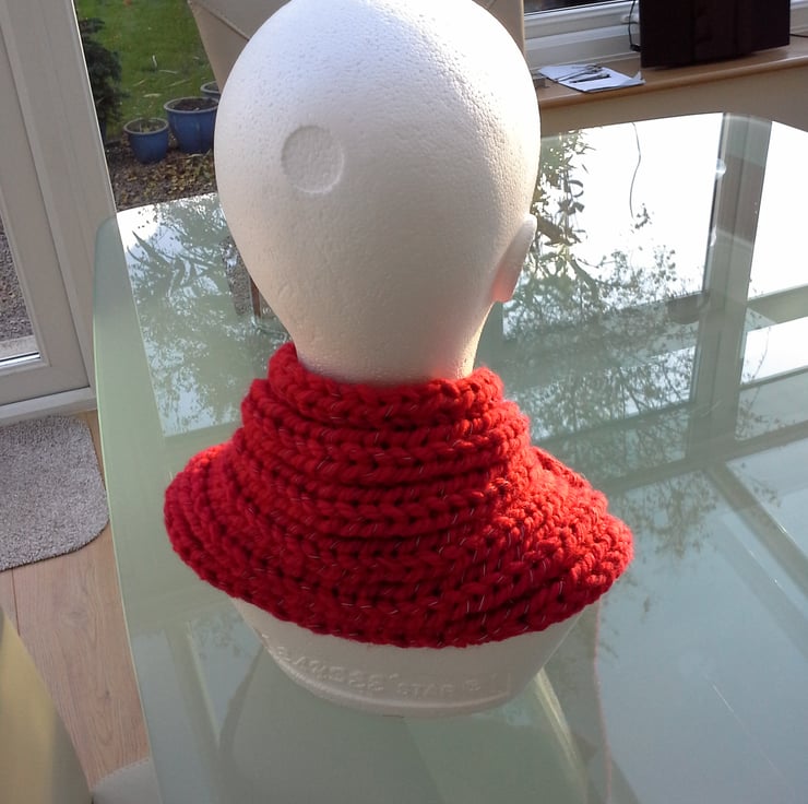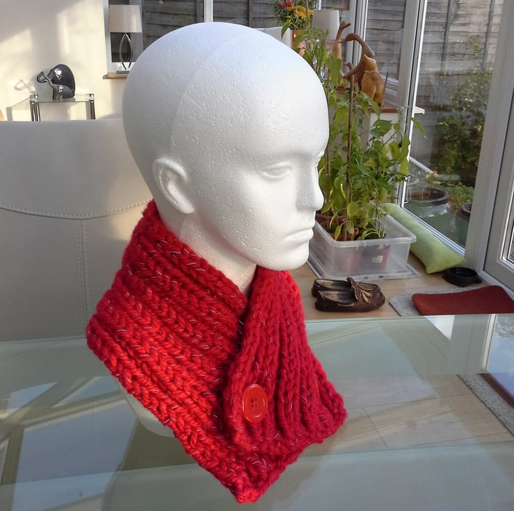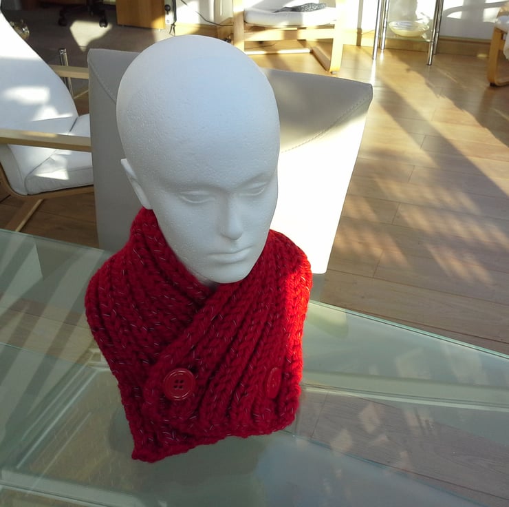 A cosy neck warmer knitted in a super chunky yarn in a double rib design. It fits snugly around the neck held in place by 2 chunky buttons.
