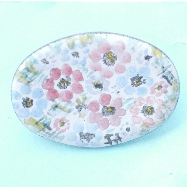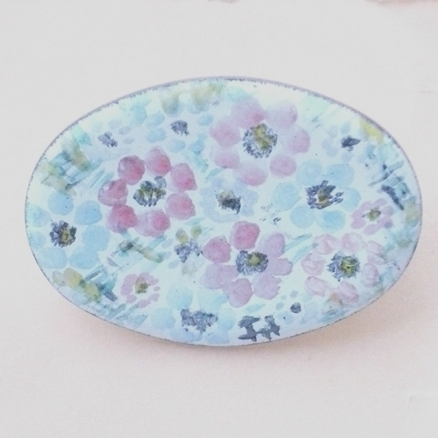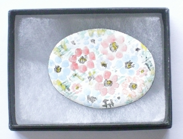 This brooch is made of white enamel on copper decorated with a picture I have painted using tablets of finely ground glass powder compressed into a tablet like a water-colour tablet. The picture is signed with my initials 'FH.'