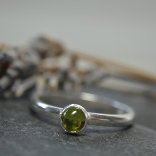 This gorgeous 5mm round peridot cabochon nestles in a sterling silver setting.