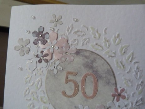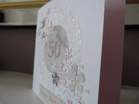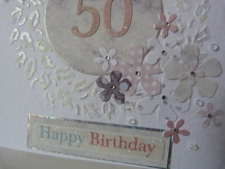 A circle of leaves embossed onto quality hammered white card, hand coloured in pale green and silver. The centre has a die cut circle of lilac shaded card. Decorated with die cut flowers in different sizes all cut from co-ordinating papers. The centres of the flowers decorated with rhinestones. Finished off with clear glass beads and a happy birthday tag.