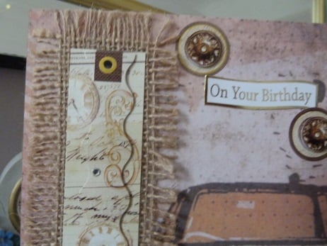 A car made specifically for those car lovers. Consisting of a car patterned paper which has been mounted onto quality white card. Further embellished with a time tag mounted onto a strip of hessian. Finished off with two wheels and a 'on your birthday' tag.