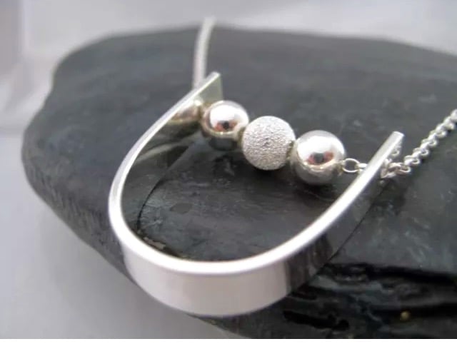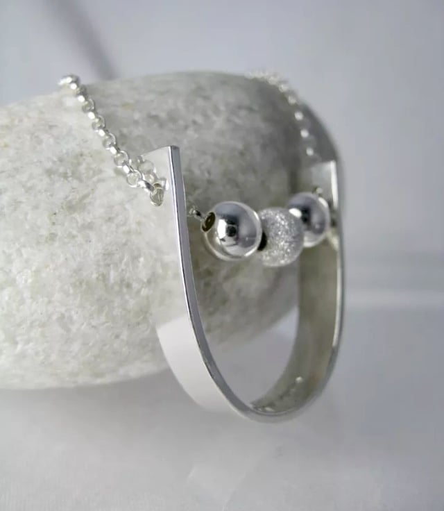 This modernist sterling silver geometric necklace incorporates two shiny and one sparkle bead which are strung onto a belcher chain with a caribiner trigger clasp as it's fastening. This necklace has a high polished finish.