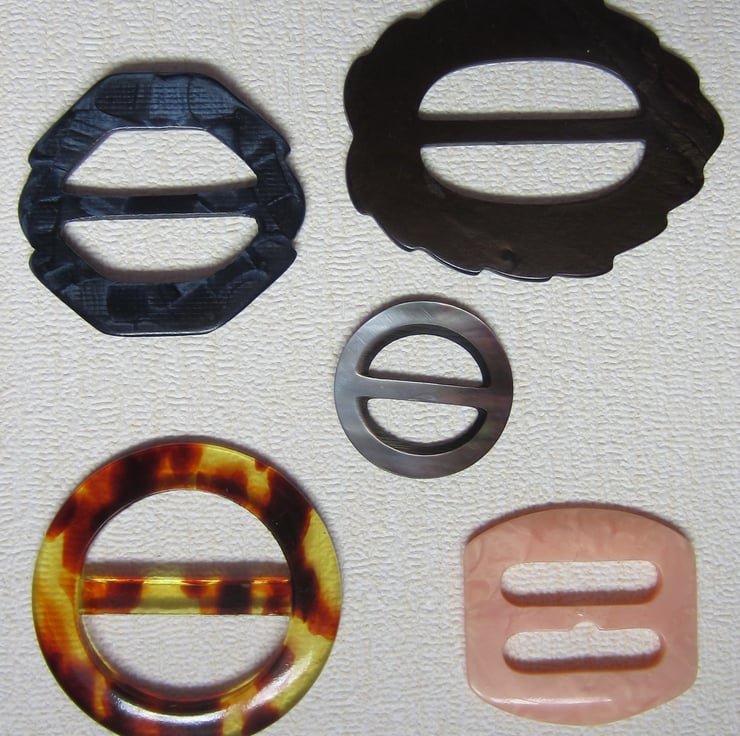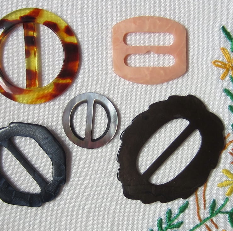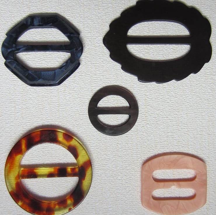 Nice selection of 5 vintage plastic buckles. Ranging in size from 3 cm (small round mother of pearl) to 6.5 cm (brown leaf shape).