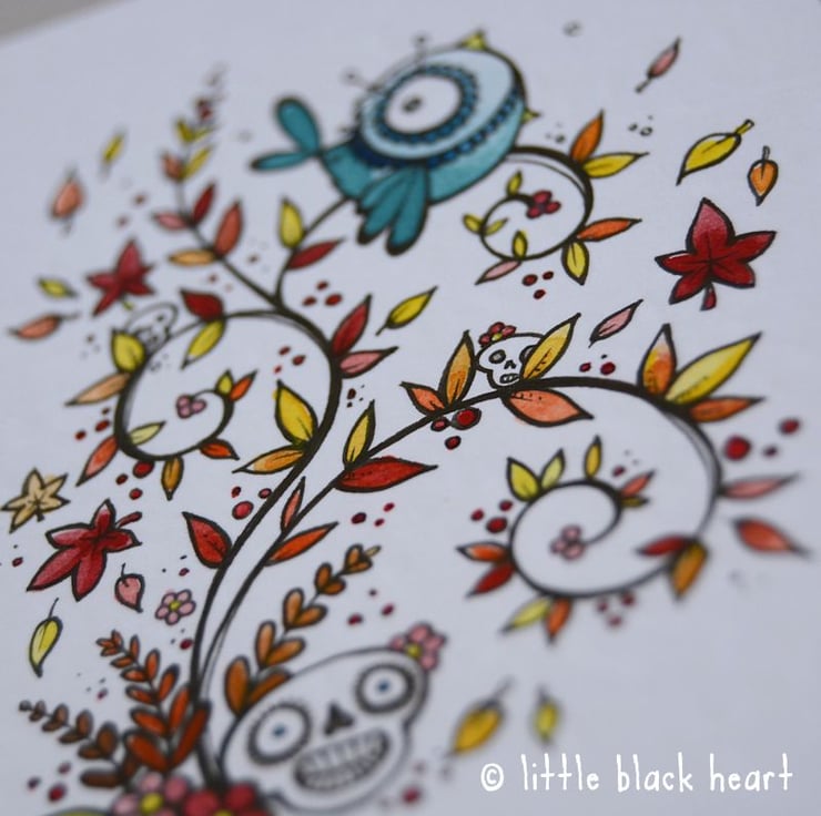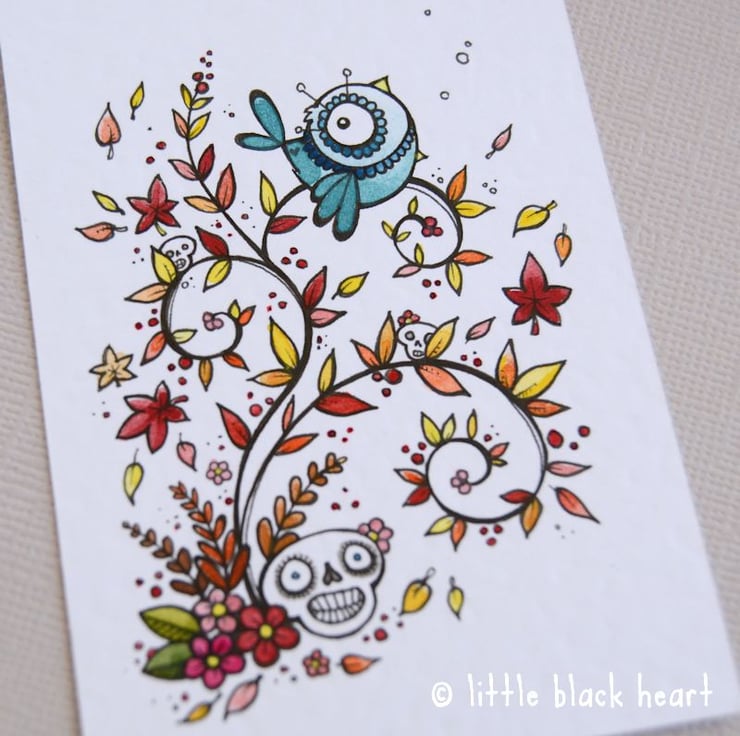 a sweet singing bluebird, and a couple of smiling skulls - all surrounded by fancy swirly bits and lots of autumnal foliage!
