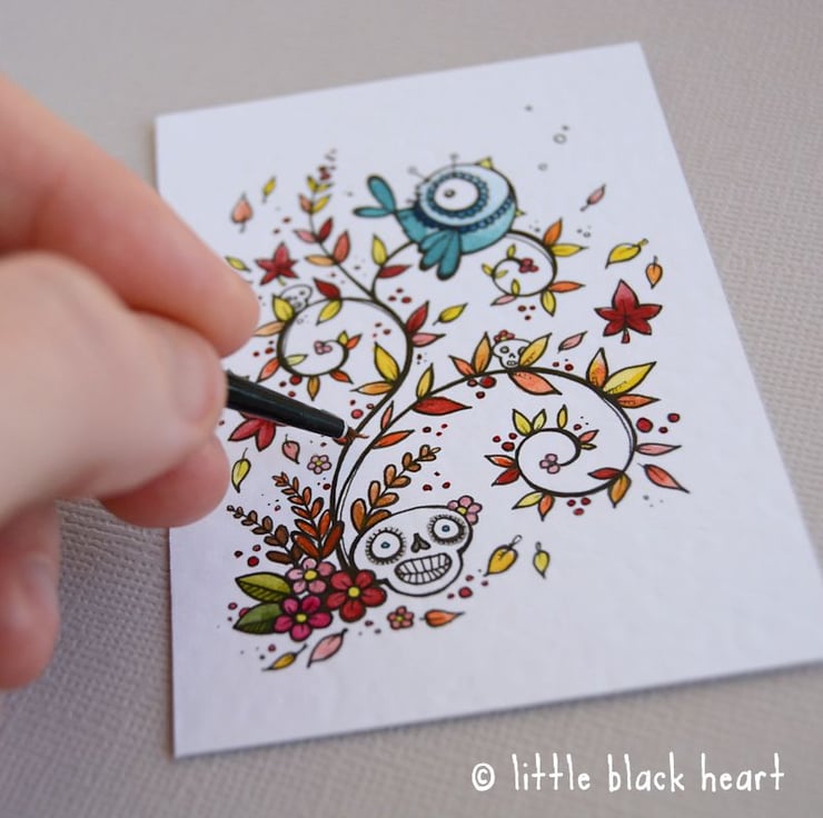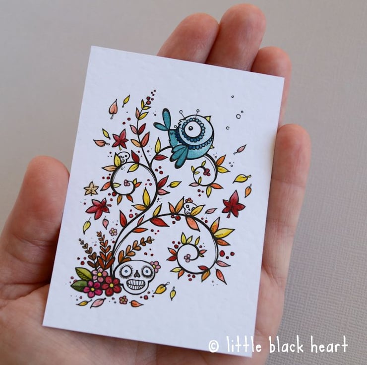 original artwork in artists pens and watercolour paints, on textured white 300gsm cardstock. drawn with a tiny 0.05 nibbed pen, and carefully painted with just the very tip of a tiny paintbrush!