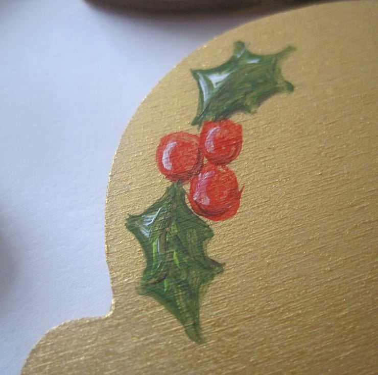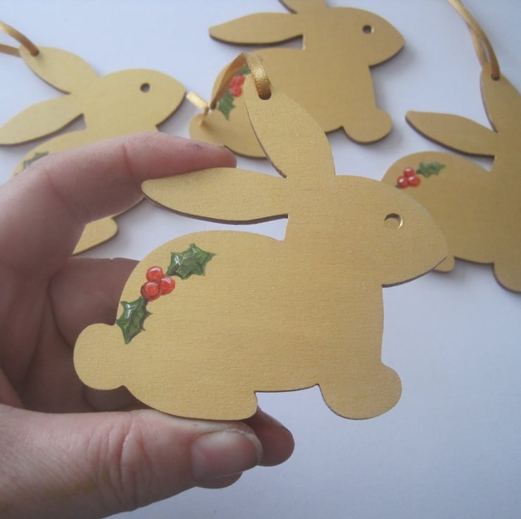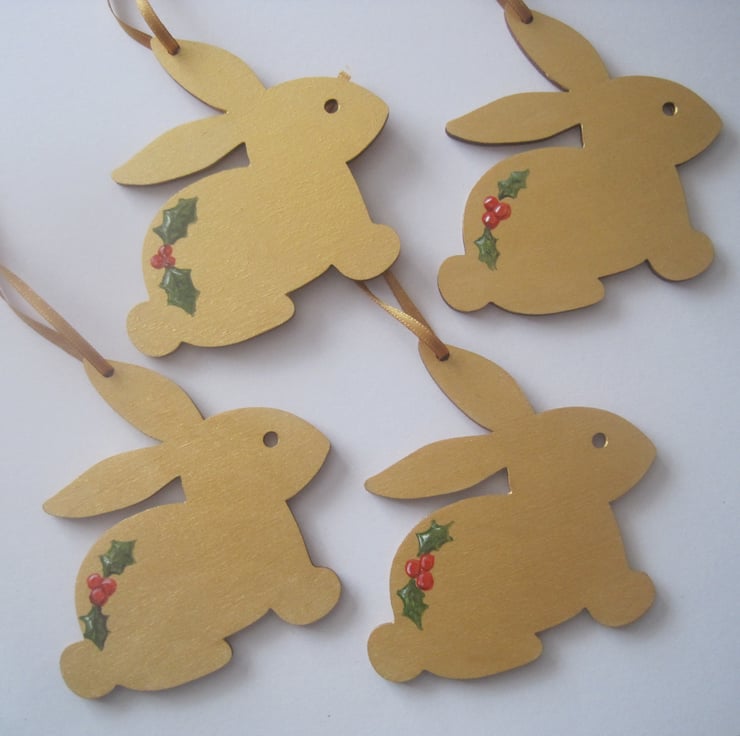 A set of four wooden bunny shaped Christmas decorations. These are made of pre-cut wooden shapes which have been painted with acrylic paints. The bunnies are dull metallic gold on both sides, and one side of each bunny has an embellishment of holly berries and leaves painted on.