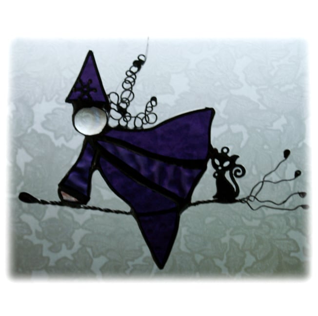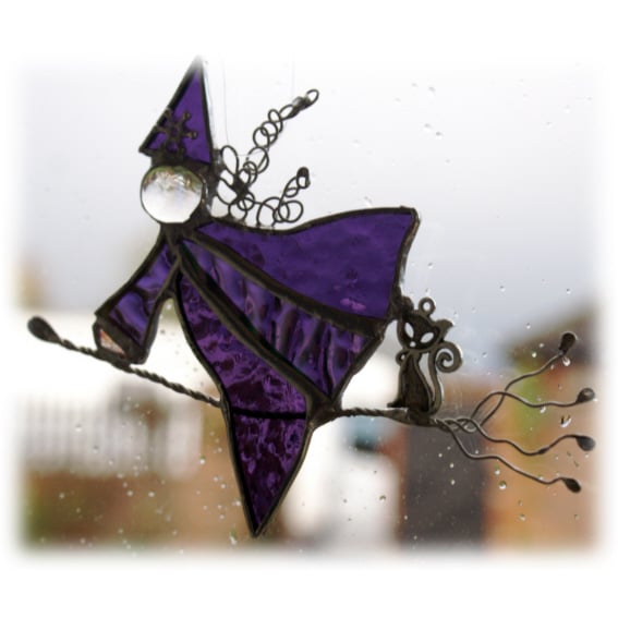 A Witch on a broomstick. This is a stained glass suncatcher made entirely by hand using the Tiffany Copper Foil technique.