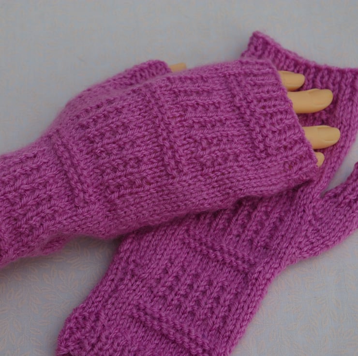 This is a knitting pattern for Fingerless Mittens or Gloves. It has a medium size cuff in order to keep wrists warm. The pattern has been design to use Double Knitting yarn and 3.75mm or Number 9 imperial knitting needles. The pattern also requires Stitch Markers and a Stitch Holder.