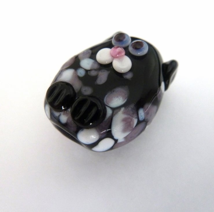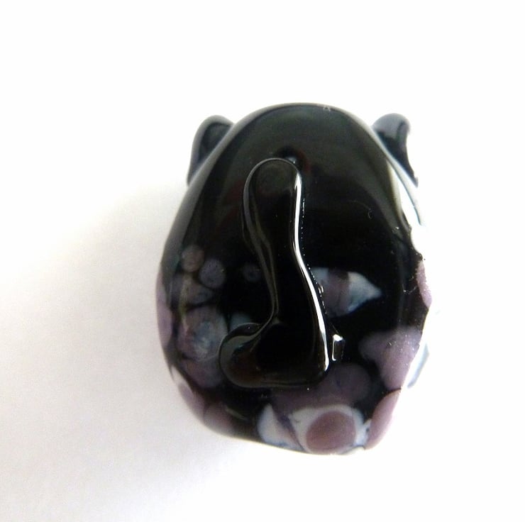 A handmade lampwork glass bead i have made into a cat using black glass and decorative frit.