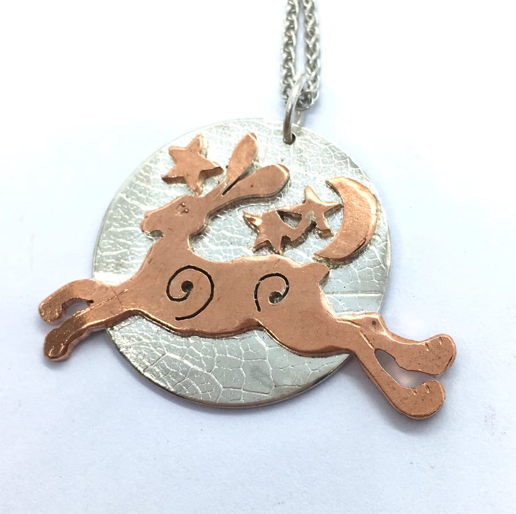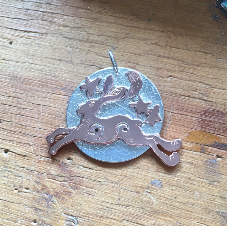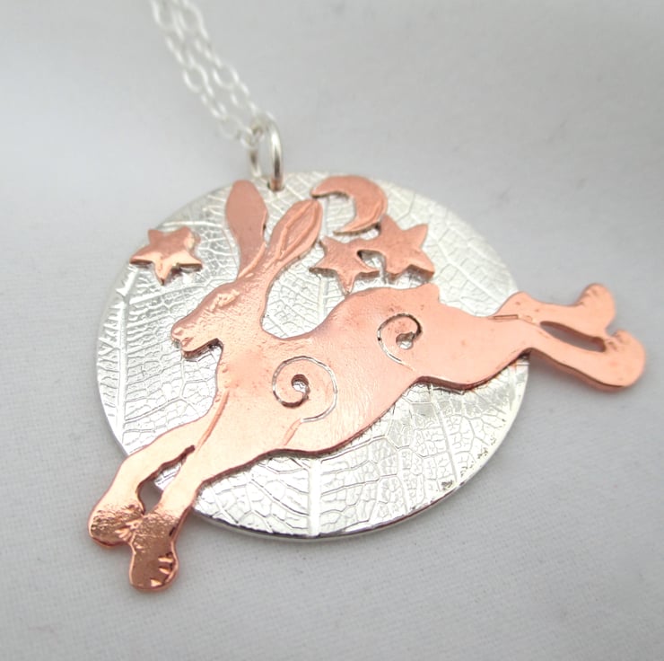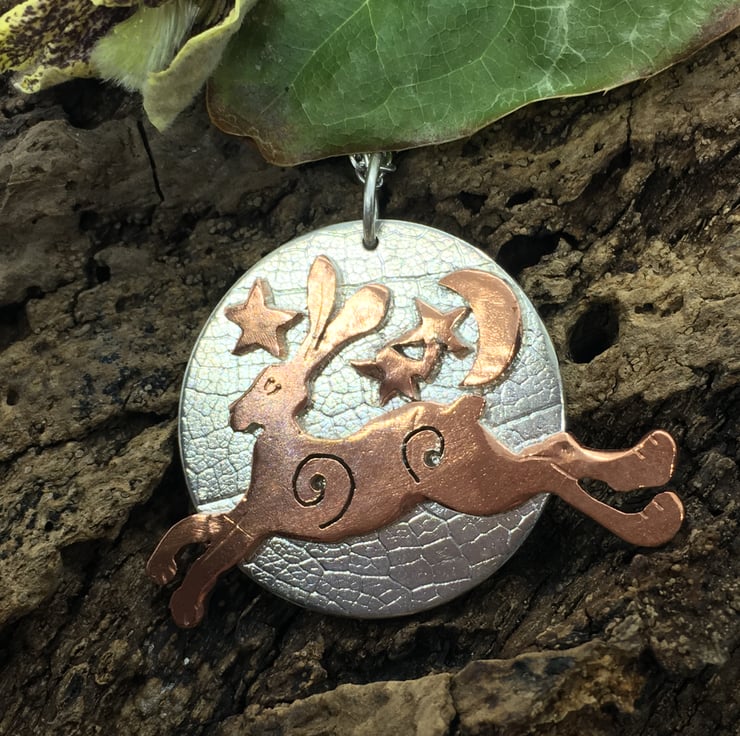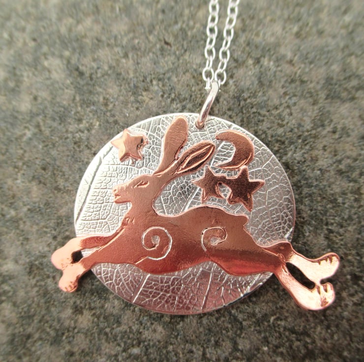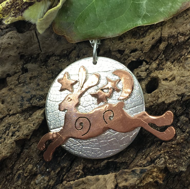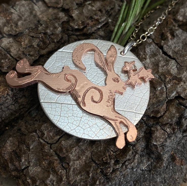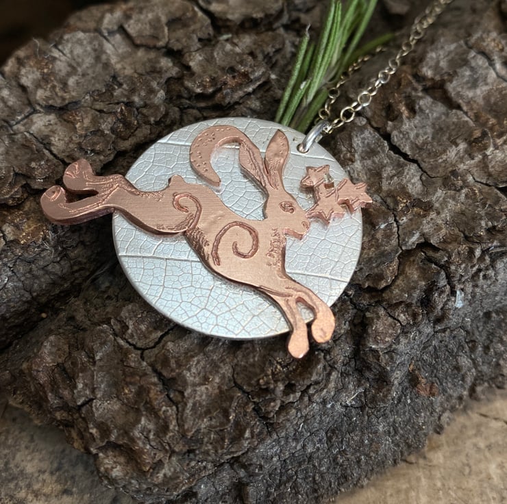 Polished woodland leaf imprinted finish with copper hare & lunar details and polished chain